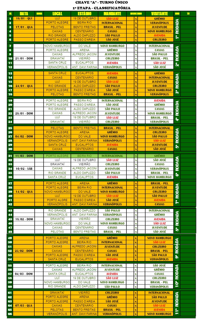Definida a tabela (veja abaixo)de jogos do Gauchão 2018. O clássico grenal está agendado para o dia 11 de março, e será válido pela 6ª rodada do campeonato. Segundo a tabela divulgada pela FGF a competição se inicia dia 17 de janeiro, a dupla joga no dia seguinte.