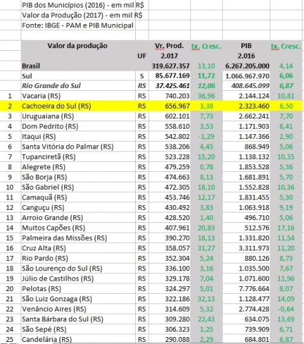 A série histórica 2007-2016 do Produto Interno Bruto de Cachoeira do Sul (RS) mostra um aumento nominal de 164,92% no período de 10 anos. Em números deflacionados pelos IPCA, o PIB do município cresceu 45,07%, atingindo R$ 2.323.640.000,00 em 2016, 33ª colocação no Estado. “O PIB per capita dos nossos 82.547 habitantes é de R$ 28,2 mil/ano” calcula o secretário de Desenvolvimento, Ronaldo Tonet.