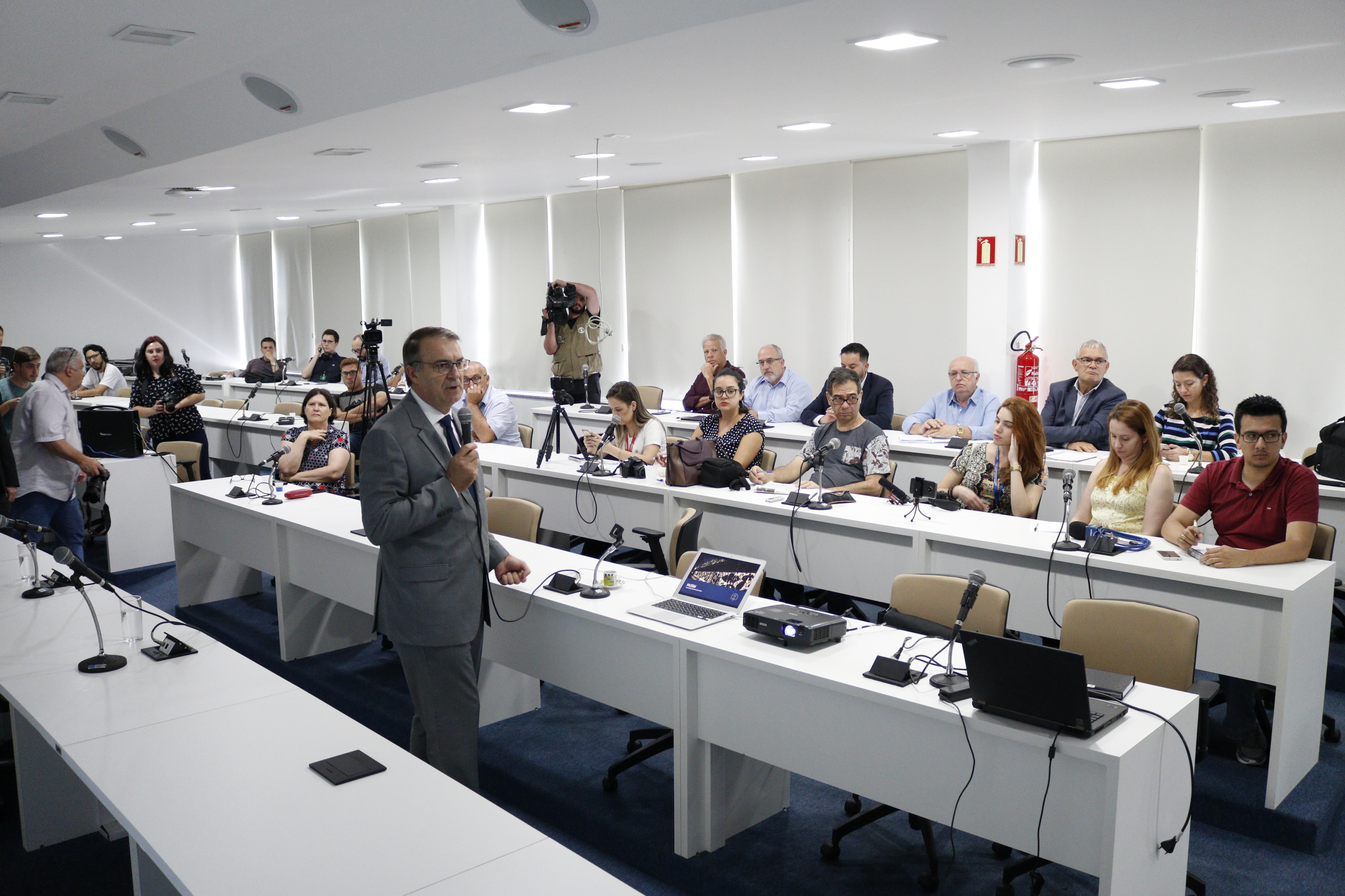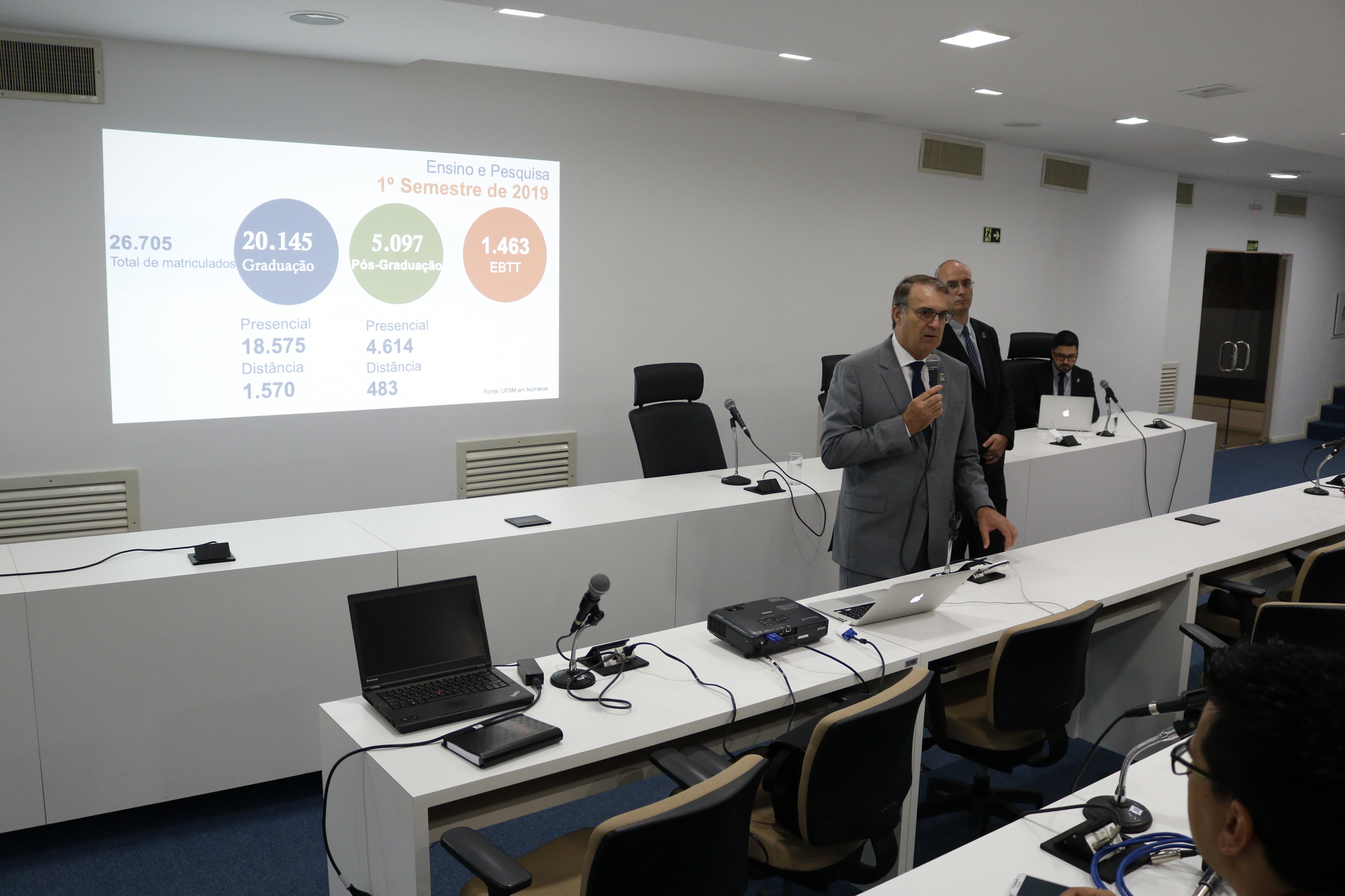 Para esclarecer dúvidas sobre as alterações no orçamento e como a Universidade pretende trabalhar neste ano, a equipe de gestão fez uma apresentação e concedeu entrevista coletiva à imprensa na manhã desta quarta-feira (23), na Sala dos Conselhos, no prédio da Reitoria. Participaram o reitor, Paulo Burmann, o vice-reitor, Luciano Schuch, pró-reitores e diretores de Unidades Universitárias.
