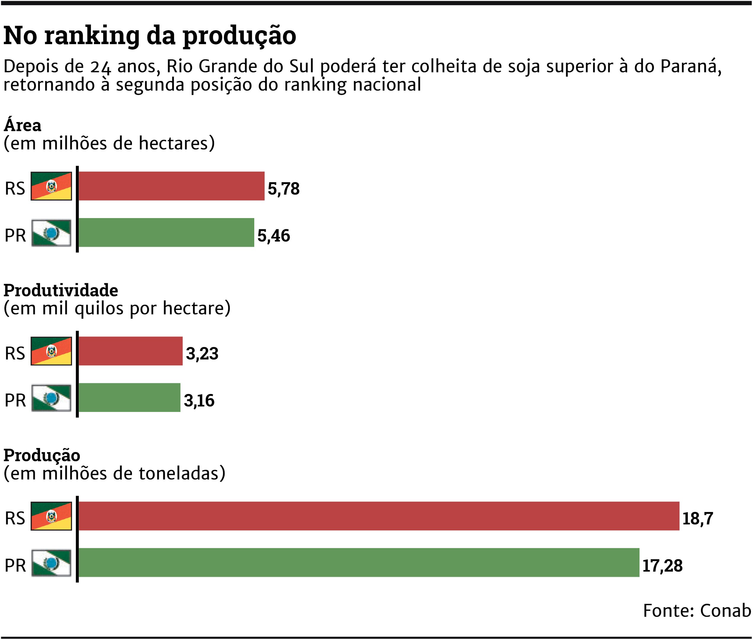 O RS também sofreu com o mau tempo e deverá ver sua produção encolher — projeção feita pela Federação da Agricultura do Estado (Farsul) é de que seja 1,04 milhão de toneladas a menos do que o inicialmente previsto, ainda assim à frente do Paraná.