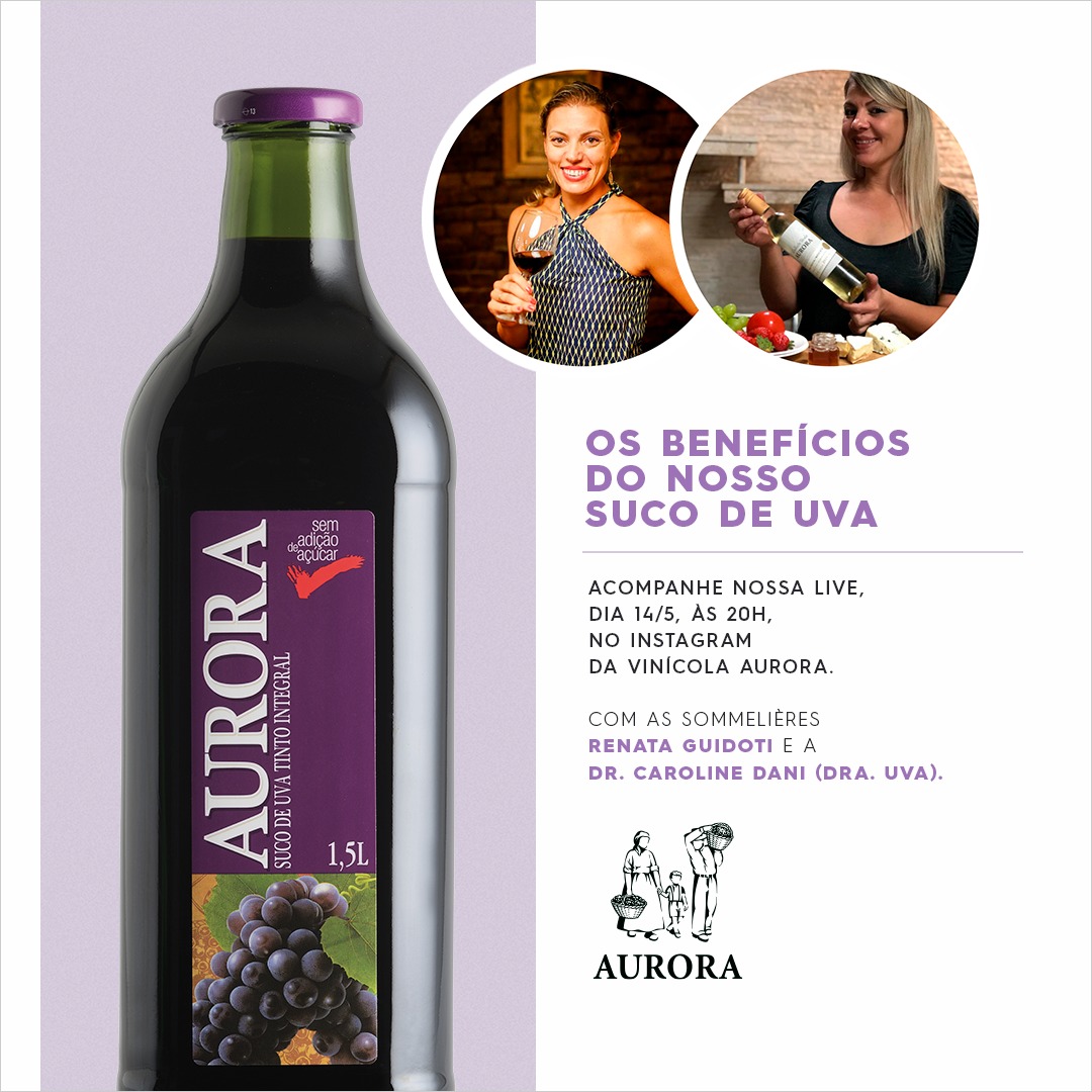 Em tempos de pandemia, suco de uva é importante aliado ao sistema imunológico,Rico em polifenóis e vitaminas, produto possui ainda outros benefícios à saúde, comprovados cientificamente. Maior produtora da bebida no país, Vinícola Aurora promove live sobre as vantagens do consumo regular, nesta quinta (14), com a biomédica Caroline Dani