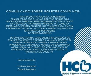 A partir desta terça-feira, a administração do Hospital de Caridade e Beneficência de Cachoeira resolveu, visando preservar a identificação dos pacientes internados, restringir os dados que constavam até então nos boletins diários, onde era possível saber sexo, idade e cidade onde moram os internados. Com a medida somente serão divulgados o número de internados na enfermaria e na UTI Covid