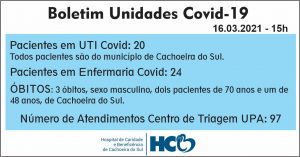 Nesta terça-feira, Cachoeira registrou 3 óbitos por Covid, todos do sexo masculino, dois com 70 anos e um de 48 anos. Estão internados 44 pacientes, sendo 20 na UTI e outros 24 na enfermaria Covid. Com as 3 mortes, a cidade chega a 57 mortes desde o início da pandemia em março de 2020.