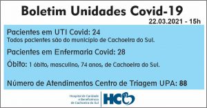 O setor de Vigilância Epidemiológica do Departamento de Vigilância em Saúde informou que nesta segunda-feira, ocorreu óbito de um homem de 74 anos no HCB. Novos 41 casos foram verificados. Junto ao HCB 24 pacientes estão junto a UTI Covid e outros 28 na enfermaria.