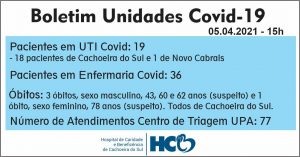 Conforme boletim do Hospital de Caridade e Beneficência divulgado na tarde desta segunda-feira, 2 óbitos por Covid ocorreram nas últimas 24 horas. Todos homens com idade de 43 e 60 anos residentes em Cachoeira, totalizando 84 mortes desde o inicio da pandemia. Ocorreu também óbito de mulher com 78 anos e homem com 62 anos com suspeita de Covid. Segundo o HCB, 55 pacientes estão internados, 19 na UTI e outros 36 na enfermaria Covid.