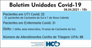 O setor de Vigilância Epidemiológica do Departamento de Vigilância em Saúde informou nesta terça-feira, 100 novos casos de pessoas diagnosticadas com Covid. Devido ao feriadão os exames feitos pelo laboratório do Estado são reprimidos da semana passada. Também  2 óbitos de casos confirmados de pacientes do sexo masculino de 62 anos e 74 anos, chegando 86 óbitos desde o início da pandemia. Junto ao HCB 53 pessoas internadas 22 na UTI e 31 na enfermaria Covid.