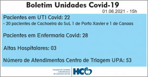 O setor de Vigilância Epidemiológica do Departamento de Vigilância em Saúde informou nesta terça-feira, 81 novos casos, destes 31 confirmados da rede pública cuja os testes ocorreram em dias anteriores e 50 de rede privada. 2 óbitos confirmados ocorridos na UPA dia 27/05/2021 (informação repassada nesta terça-feira para Secretaria de Saúde) paciente do sexo feminino, 90 anos e paciente do sexo masculino, 82 anos.Com isso, Cachoeira chega 129 óbitos desde o início da pandemia. Junto ao HCB, 50 pacientes, destes 22 na UTI e 28 na enfermaria. 3 pessoas tiveram alta hospitalar.