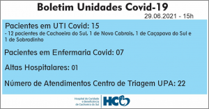 Junto ao HCB, 22 pacientes internados, destes 15 na UTI e 7 na enfermaria Covid. Nesta terça-feira, ocorreu uma alta hospitalar