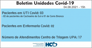 Junto ao HCB, 5 pacientes, destes 2 pessoas de Cachoeira e 1 de Cerro Branco na UTI Covi e 2 na enfermaria
