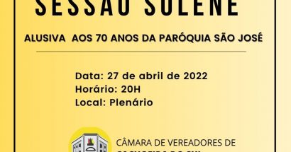 Ler maisA Câmara de Vereadores de Cachoeira do Sul realiza nesta quarta-feira, dia 27, sessão solene alusiva aos 70 anos da Paróquia São José. A solenidade