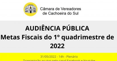Ler maisAs metas fiscais do 1º quadrimestre de 2022 (janeiro a abril) serão apresentadas nesta terça-feira, 31, às 14h, em audiência pública na Comissão de Finanças