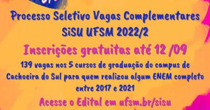 Ler maisAté 12 de setembro, estão abertas as inscrições para o Processo Seletivo Vagas Complementares SiSU/UFSM 2022-2. Os cinco cursos de graduação do campus da UFSM