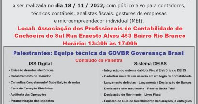 Ler maisA Secretaria Municipal da Fazenda está programando para o próximo dia 18 de novembro, uma palestra sobre a implantação do ISS/Digital e NFSe sistema Deiss.