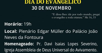 Ler maisO plenário Edgar Müller, da Câmara de Vereadores, recebe nesta quinta-feira, 30, Sessão Solene alusiva ao Dia do Evangélico. Durante o evento, será homenageado o