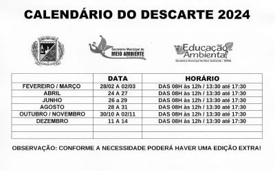 A Secretaria Municipal de Meio Ambiente através do seu setor de Educação Ambiental, informa a população o calendário de datas para as Semanas do Descarte de 2024.