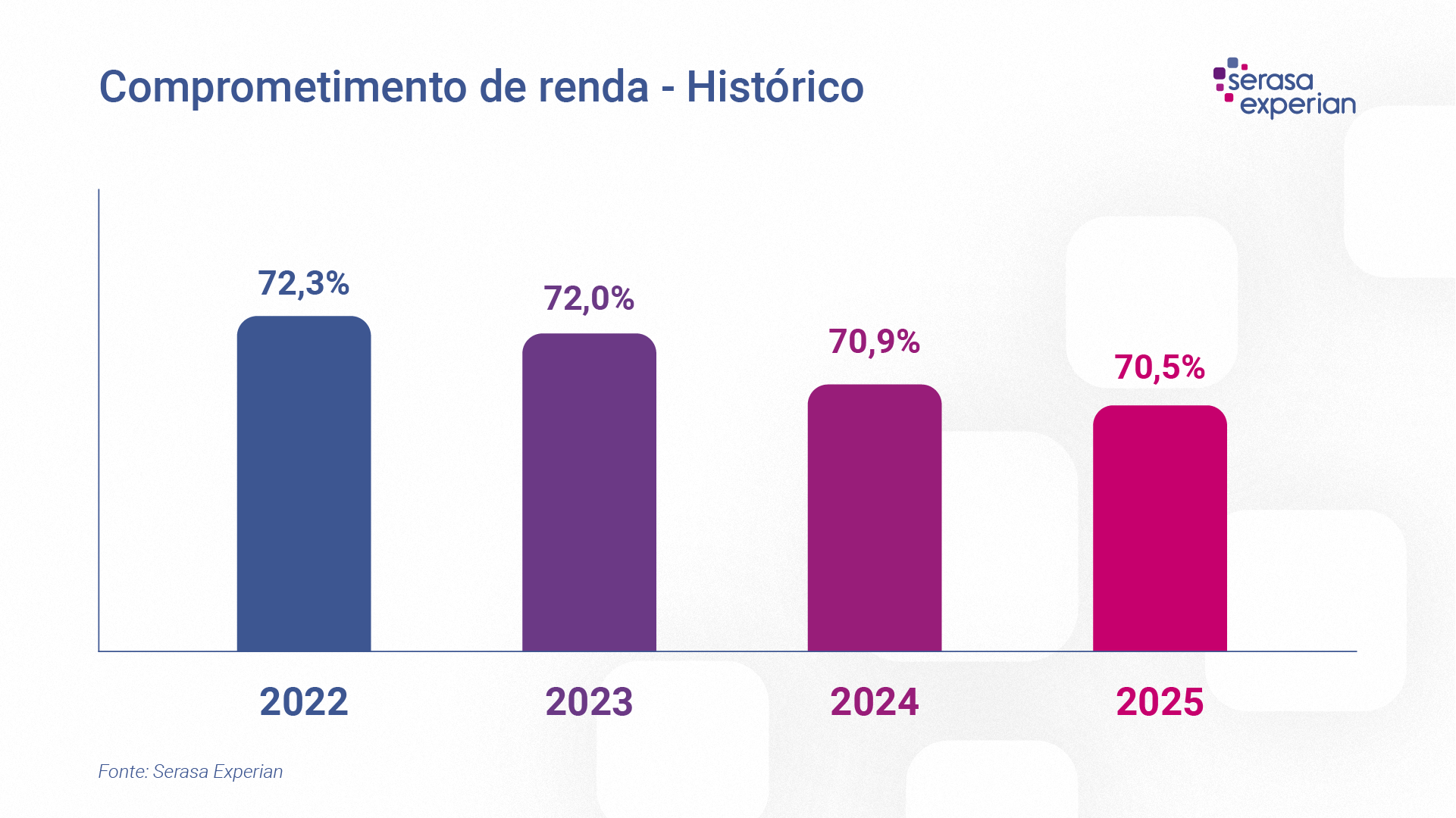 Já em termos históricos, é possível observar uma leve queda ao longo dos anos. No comparativo entre o primeiro ano da série histórica com o último, houve uma queda de 1,8 p.p., saindo de um comprometimento médio geral de 72,3% em 2022 para 70,5% em 2025. Abaixo, o detalhamento ano a ano. |