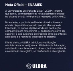 A divulgação das notas do Exame Nacional de Avaliação dos Cursos de Medicina (ENAMED) gerou questionamentos por parte da Universidade Luterana do Brasil (ULBRA). A instituição se manifestou oficialmente após tomar conhecimento da nota atualmente exibida no sistema e-MEC, mantido pelo Ministério da Educação (MEC).