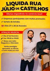 Mais uma vez, empresas da Rua Júlio de Castilhos trecho entre rua Juvêncio Soares e Ernesto Alves se uniram para realizar a segunda edição do Liquida Júlio. O evento ocorrerá nesta sexta(27) e sábado (28), quando estarão oferecendo em horário estendido até às 21 horas, na sexta-feira, diversas promoções e condições de produtos que vendem para população de Cachoeira. Desta vez a a via não será fechada para o trânsito de veículos, parte da calçada será ampliada para o show com John Nogueira e Dionatan na sexta feira as 19:30 horas. . No sábado, o Liquida Júlio vai até às 18 horas,