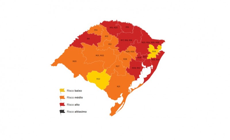 Somente as regiões de Taquara e Bagé se encontram em bandeira amarela (risco baixo). As regiões de Santa Maria, Uruguaiana, Cruz Alta, Ijuí, Santa Rosa, Pelotas, Cachoeira do Sul, Santa Cruz do Sul e Lajeado estão em bandeira laranja (risco médio). A região de Santa Rosa, que se encontrava na bandeira amarela, mas evoluiu, nesta rodada, para a laranja.