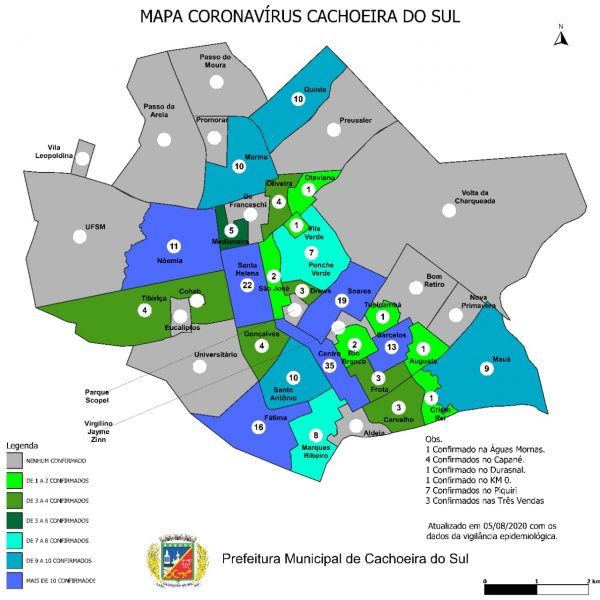 Secretaria Municipal de Saúde através do departamento de vigilância sanitária divulgou nesta quarta-feira, o mapa dos bairros e locais do interior com casos registrados de Covid. A região do Centro, seguido dos bairros Santa Helena e Soares são os locais com maior incidência. No interior, Piquiri e Três Vendas. Veja casos a caso por bairro no abaixo: