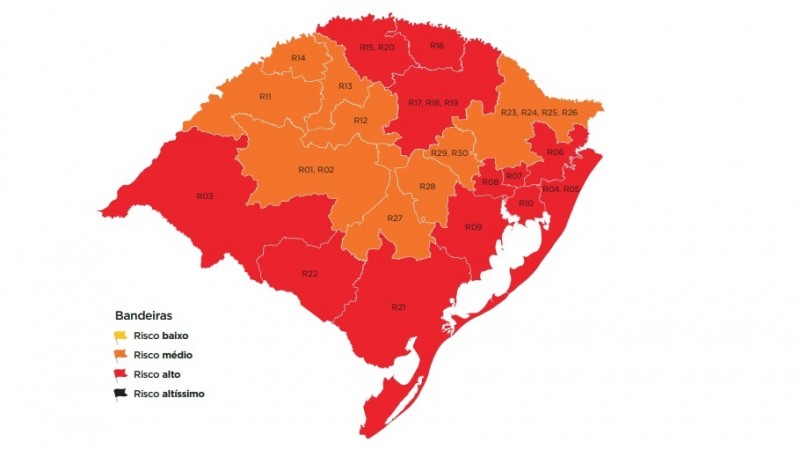 Guaíba, inclusive, é uma das 12 classificadas como risco epidemiológico alto na versão preliminar do mapa, ao lado de Capão da Canoa, Palmeira das Missões, Erechim, Pelotas, Bagé e Uruguaiana. As regiões de Novo Hamburgo, Porto Alegre, Canoas, Taquara e Passo Fundo já estavam na bandeira vermelha na 13ª rodada e foram mantidas. A região de Lajeado apresentou melhora nos indicadores e reduziu para a bandeira laranja.