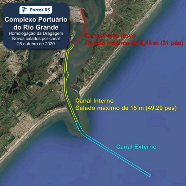 Depois de dois anos de obras de dragagem com investimento federal de R$ 500 milhões, o principal porto gaúcho poderá receber embarcações de até 366 metros de comprimento – tamanho dos maiores navios do mundo. Em cerimônia transmitida pelas redes sociais, com a presença do governador Eduardo Leite, do ministro da Infraestrutura, Tarcísio Gomes de Freitas, e de outras autoridades em Porto Alegre, foi homologado o novo calado do porto do Rio Grande.