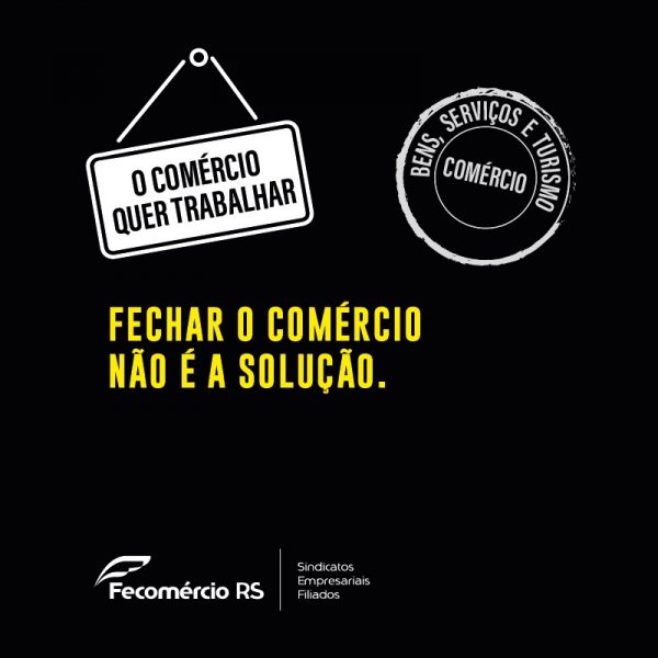 Após decretada a bandeira preta em todo território gaúcho, o que culminou no fechamento das empresas do comércio, a Fecomércio-RS (Federação do Comércio de Bens e de Serviços do Estado do RS) retomou a campanha “O comércio quer trabalhar”. A ideia é sensibilizar a sociedade para a importância do funcionamento do setor de bens, de serviços e de turismo do RS, e defender a volta permanente, ao mostrar que as lojas de portas abertas não são o foco da transmissão da Covid-19. A ação é toda registrada no site www.fecomercio-rs.org.br/ocomercioquertrabalhar.