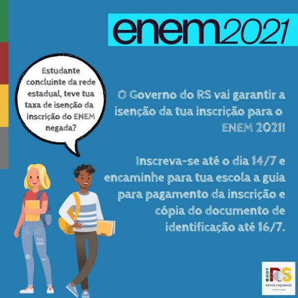 O prazo para inscrição no Enem 2021 se encerra dia 14 de julho. O estudante deve entregar a guia de pagamento para a direção da escola até o dia 16 de julho.