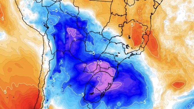 A MetSul projeta marcas negativas ou próximas de 0ºC em grande número de cidades do Rio Grande do Sul e de Santa Catarina na primeira metade da próxima semana. Pontos de baixadas do Noroeste gaúcho podem registrar -3ºC a -4ºC. A área de Santa Maria, no Centro gaúcho, pode ter 1ºC a 2ºC. Em Uruguaiana, no Oeste, 2ºC a 4ºC de mínimas na primeira metade da semana que vem. Na fronteira com o Uruguai, Quaraí e Livramento podem baixar a marcas de -2ºC a 0ºC nas madrugadas maias frias. E, no Sul, na região de Pelotas pode fazer 1ºC ou 2ºC.