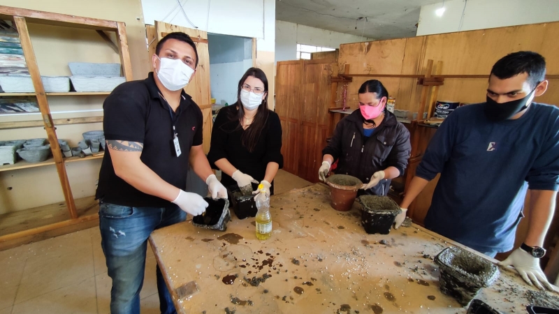 O secretário Itamar Luz, da Secretaria Municipal da Inclusão Social, e a coordenadora do Cras Zona Norte, Graziele Lopes, participaram da oficina colocando a mão na massa junto com os demais participantes.