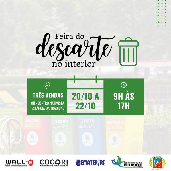 O distrito de Três Vendas receberá entre os dias 20 e 22 de outubro a Feira do Descarte, promovida pela Secretaria Municipal do Meio Ambiente em parceria com a Emater. Essa é a primeira vez que a proposta de recolhimento correto de material vai para o interior.