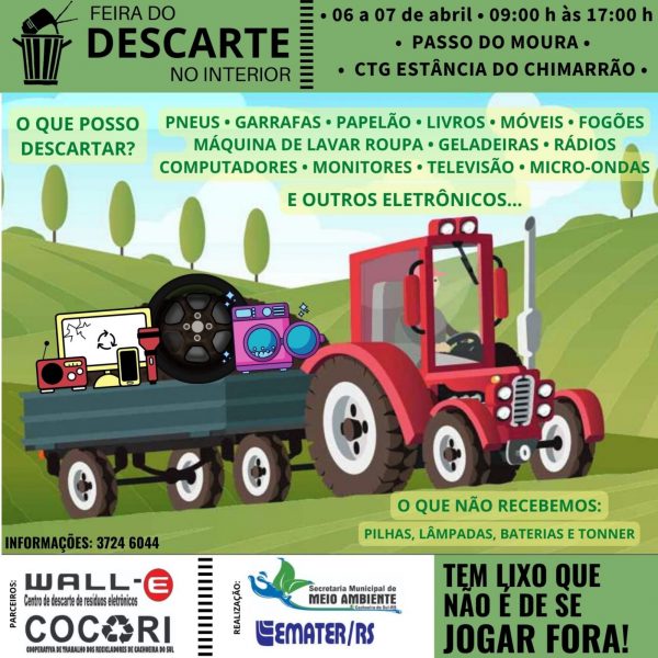 O descarte pode ser feito neste dois dias das 9h às 17h no CTG Estância do Chimarrão. Os moradores poderão descartar, de forma correta, bens inservíveis, eletrônicos e pneus. O contato para mais informações pode ser feito pelo telefone 3724.6044 das 8h às 12h e das 13h30min às 17h30min.