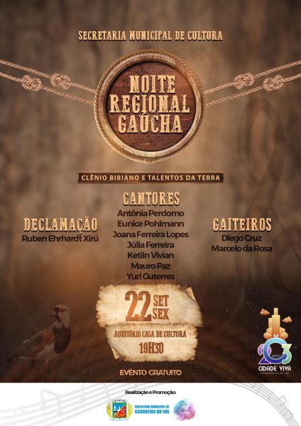 A Secretaria Municipal da Cultura promove no próximo dia 22, a partir das 19h30min no Auditório da Casa da Cultura, a Noite Regional Gaúcha em alusão à Semana Farroupilha. Estão confirmadas as presenças de Clênio Bibiano e Talentos da Terra e dos cantores Antônia Perdomo, Eunice Pohlmann, Joana Ferreira Lopes, Júlia Ferreira, Ketlin Vivian, Mauro Paz e Yuri Guterres, além dos gaiteiros Diego Cruz e Marcelo da Rosa. Haverá ainda performance de declamação com Ruben Ehrhardt Xirú. O evento é gratuito.
