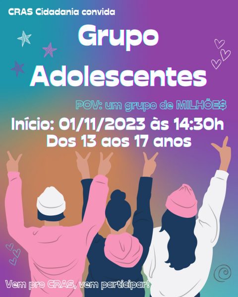 O CRAS Cidadania está com inscrições abertas para um novo grupo de adolescentes com idades entre 12 e 17 anos, desde que residam em um dos 14 bairros abrangidos pelo CRAS. O início das atividades está programado para o dia 1º de novembro, com encontros semanais no local.