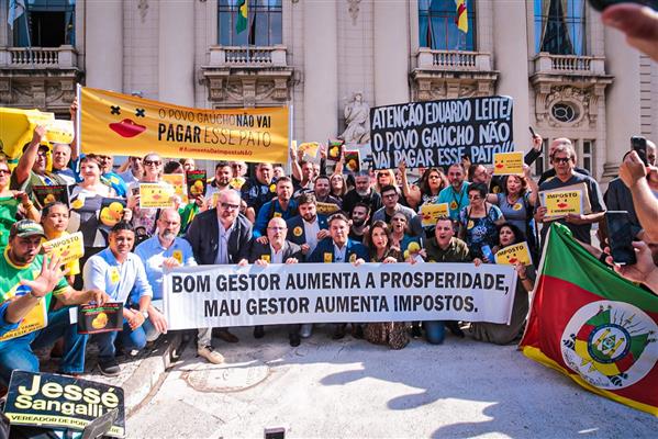Munidos de cartazes com críticas a Leite, com dizeres “O povo gaúcho não vai pagar o pato”, lema entoado também em coro, e outras que atrelavam aumento de impostos a maus gestores, manifestantes que estiveram pressentes no ato e parlamentares deixaram a Assembleia e foram até a frente do Palácio Piratini em protesto.