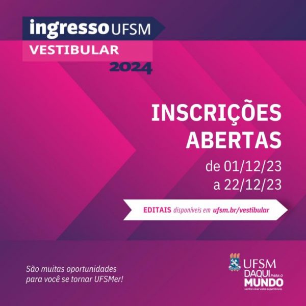 As inscrições podem ser feitas até 22 de dezembro, pelo link disponível na página do Processo Seletivo Seriado UFSM 2024. A taxa de inscrição do vestibular é de R$ 60,00 e deve ser paga até 26 de dezembro.