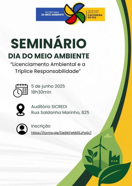 Dentro da programação da Semana do Meio Ambiente, a Prefeitura de Cachoeira do Sul, por meio da Secretaria de Meio Ambiente, promove o Seminário “Licenciamento Ambiental e a Questão Hídrica”, que acontecerá nesta quinta-feira, dia 5 de junho, às 18h30, no auditório do Sicredi.