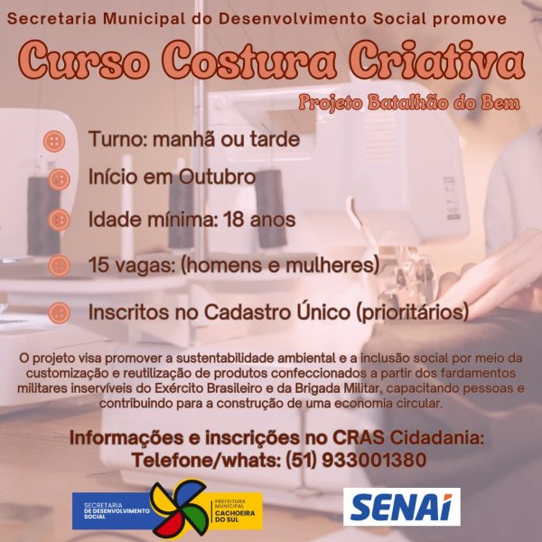 Já o Curso de Costura Criativa, do Projeto Batalhão do Bem, começará em outubro, com turmas nos turnos da manhã ou da tarde. São 15 vagas destinadas a homens e mulheres maiores de 18 anos. A iniciativa busca promover a sustentabilidade ambiental e a inclusão social por meio da customização e reutilização de produtos confeccionados a partir de fardamentos militares inservíveis do Exército Brasileiro e da Brigada Militar, capacitando pessoas e contribuindo para a construção de uma economia circular.