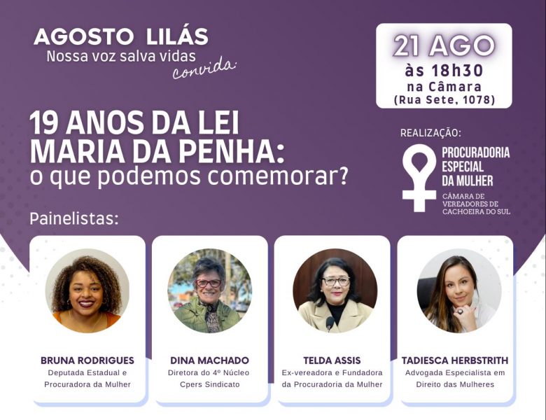 O Legislativo municipal realiza na quinta-feira, 21, às 18h30, o Painel “19 anos da Lei Maria da Penha: o que comemorar?”, com organização da Procuradoria Especial da Mulher. O evento ocorre no Plenário Edgar Müller do Palácio Legislativo João Neves da Fontoura, e é aberto ao público.