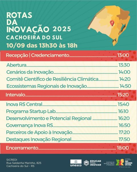 O evento é promovido pelo Governo do Estado, por meio da Secretaria de Inovação, Ciência e Tecnologia, com apoio de instituições locais e regionais, e promete colocar Cachoeira do Sul em evidência no mapa da inovação do Rio Grande do Sul.