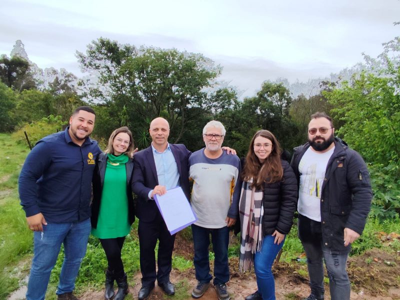 O prefeito Leandro Balardin, a secretária Paola Braga e a equipe da Secretaria Municipal de Gestão, Governança, Parcerias e Inovação participaram da ordem de serviço do Contrato com a empresa Pura Engenharia Ltda., de Juiz de Fora (MG), para a execução da obra de reconstrução de encosta localizada junto à Rua das Bauhínias na Funcap.