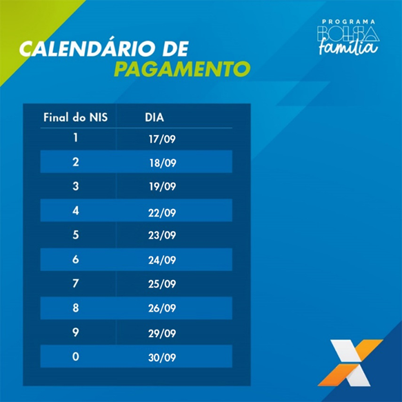 CAIXA inicia, nesta quarta-feira (17), o pagamento do Programa Bolsa Família referente ao mês de setembro. As famílias que recebem seu benefício pelo CAIXA Tem podem movimentar os recursos pelo App. O pagamento do benefício é realizado de acordo com o final do Número de Identificação Social – NIS. Ao todo cerca de 19,2 milhões de famílias recebem o Bolsa Família.