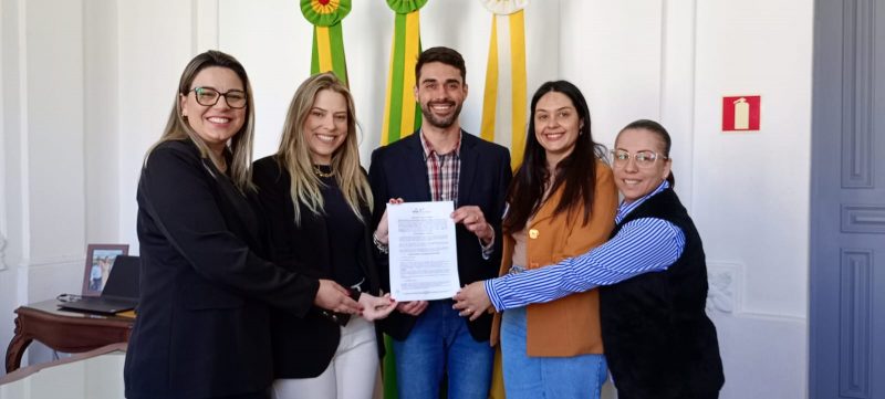 A entrega do termo de cooperação ocorreu com a presença de representantes do Senac, da Secretária Municipal de Educação, Carla da Luz Zinn, da diretora de Educação, Patrícia Hiores, e do Procurador-geral do Município, Bruno Müller.