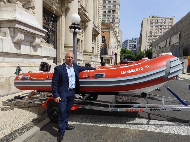 O prefeito Leandro Balardin participou, nesta quinta-feira (18), em Porto Alegre, do Ato de Entrega de Equipamentos e Viaturas para a Segurança Pública, realizado pelo governo do Estado. Durante a cerimônia, Cachoeira do Sul foi contemplada com um bote semirrígido de 15 pés (4,5 metros), equipado com motor de 50HP, destinado ao 4º Batalhão de Bombeiros Militares (4º BBM).