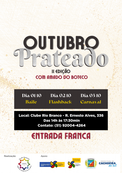 Cachoeira do Sul receberá a segunda edição do Outubro Prateado, evento que neste ano contará com a animação de Amado do Boteco. A programação acontecerá na Sociedade Rio Branco, nos dias 1º, 2 e 3 de outubro, das 14h às 17h30min, com entrada franca.