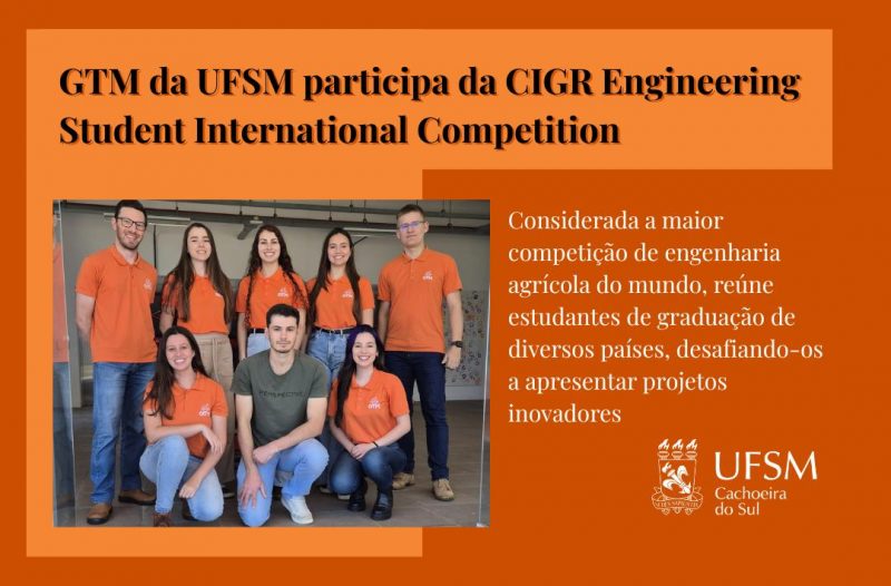 O Grupo de Tecnologia em Máquinas Agrícolas (GTM) da UFSM Campus Cachoeira do Sul está participando da CIGR Engineering Student International Competition, a maior competição estudantil de Engenharia Agrícola do mundo. O evento reúne estudantes de graduação de diversos países, desafiando-os a apresentar projetos inovadores, individuais ou em grupo, em sete áreas técnicas da engenharia agrícola. Os vencedores recebem certificado e premiação, e o grande vencedor geral garante financiamento integral para apresentar sua pesquisa no CIGR World Congress 2026, que será realizado em Turim, Itália.