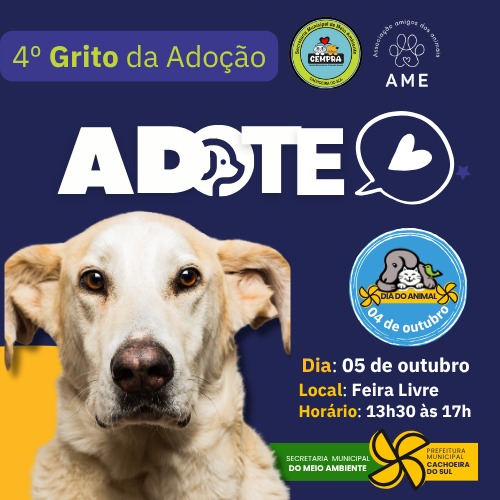 A Prefeitura de Cachoeira do Sul, por meio da Secretaria Municipal do Meio Ambiente e do Centro Municipal de Proteção aos Animais (CEMPRA), e a AME promovem no próximo domingo, 5 de outubro, o 4º Grito da Adoção.
