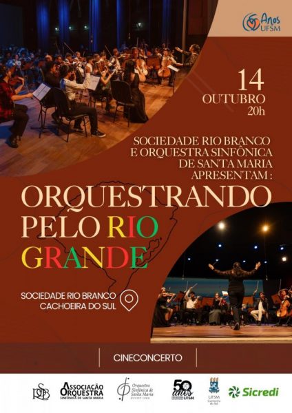O Salão Principal da Sociedade Rio Branco (SRB) será palco, nesta terça-feira 14, às 20h, de uma noite inesquecível com a Orquestra Sinfônica de Santa Maria. O espetáculo integra o projeto “Orquestrando pelo Rio Grande” e chega a Cachoeira do Sul com a promessa de emocionar o público e valorizar a força da música clássica.