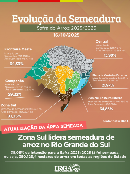 Na região da Campanha, os dados indicam 39.639 hectares semeadas, o que representa, 29,22% da intenção. Já na Região Central, são 13,99%, ou seja, 16.886 hectares. O relatório atualizado informa ainda, que na Região da Planície Costeira Interna, os hectares semeados representam 34,85% da intenção, ou seja, 48.950 ha, enquanto na Região da Planície Costeira Externa, são 20.851 hectares, representando 21,97% da intenção de semeadura de arroz.