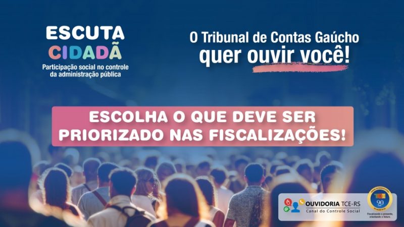 O Tribunal de Contas do Estado do Rio Grande do Sul (TCE-RS) lançou, a pesquisa do projeto Escuta Cidadã, uma iniciativa que visa ampliar a participação da sociedade nas ações de controle da administração pública. Por meio da consulta, a população poderá ajudar a definir as áreas prioritárias a serem fiscalizadas pelo TCE gaúcho. O governo do Estado é parceiro na divulgação da pesquisa, que ficará disponível até 10 de novembro.